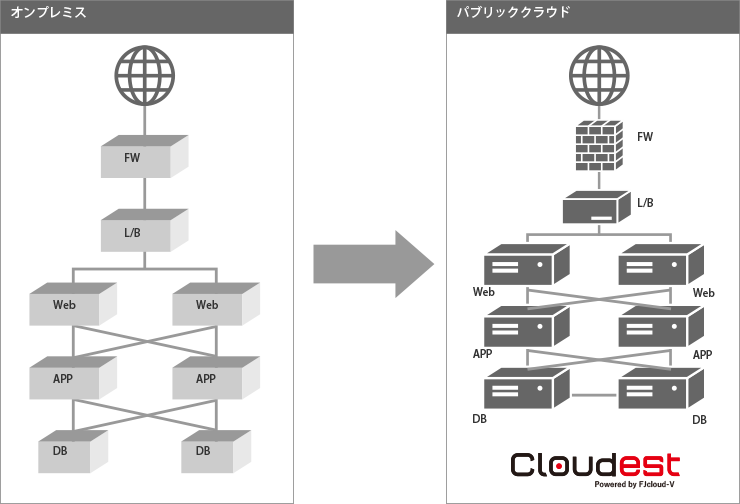 オンプレミス環境で稼働する基幹システムのサーバーやOSの保守サポート終了など企業が抱える問題は多岐に及びます。オンプレミス環境からパブリッククラウド「Cloudest」への移行により、ハードウェアに依存せず、変化するビジネス環境において優れた可用性・拡張性を備えたシステム基盤を実現します。クラウド上にサーバーシステムを移行する為、運用負担の軽減および自然災害対策として万が一に備えることも可能です。